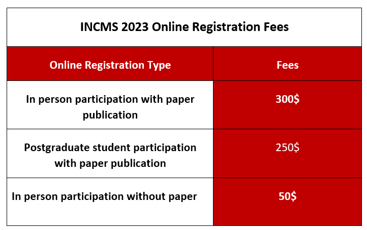 Authors of accepted papers are invited to register their participation in the INCMS2023. Following your registration, you will receive your invoice and acceptance letter.